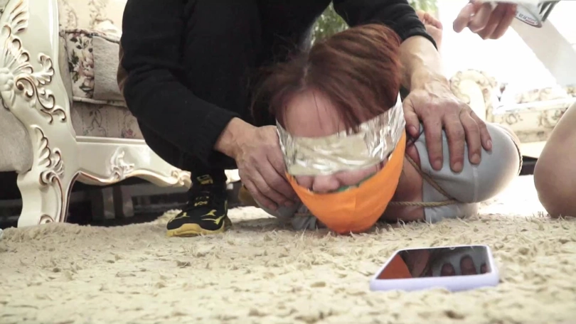 (不一会儿)只见梁静坐在沙发上扭动身体挣扎,锁哥坐在梁静身后拿绳子捆她,夏炎按住梁静双腿。
