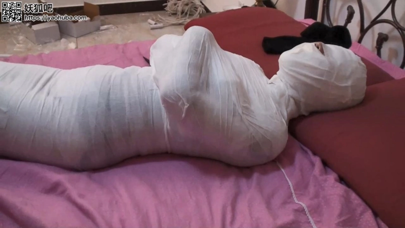 李然双腿拼拢,夏炎脱下李然腿上的袜套,然后用绷带从李然的脚踝开始往上缠绕,过程中不忘抚摸李然的双腿和婀娜的身躯。而同一时间,男劫匪从李然的手指开始用绷带包起来,然后就是整条手臂。左右手臂被分别包裹后,男劫匪要求李然把双手交叉的放在胸前,然后从李然的双膊开始包起来。他怕包裹不够严密,用上了多圈的绷带将她的上身包成洁白色。