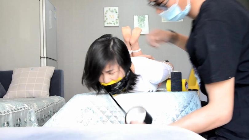 穿着白色锦纶丝袜的小楠坐在床上拼命挣扎,一度挣脱了手腕处的捆绳,试图用手指拽出口中的脏内裤,但被劫匪过来发现。
