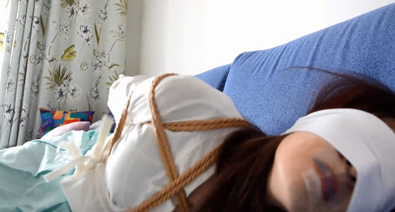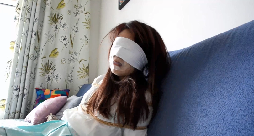 之后被绑起来,透明胶带封嘴,白丝蒙眼,然后就是一阵束缚,