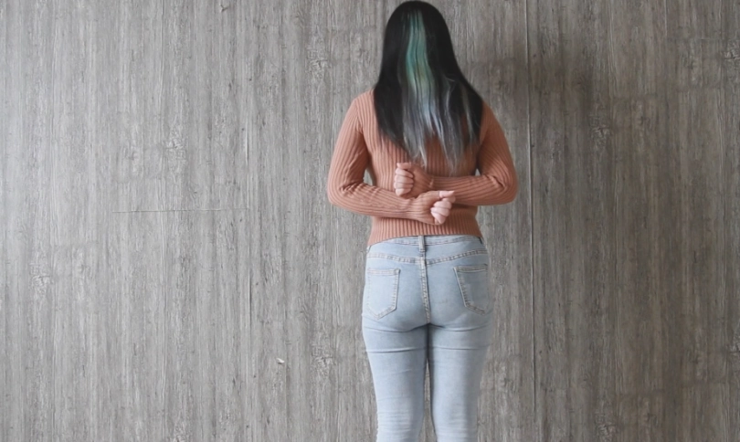 棕色毛衣牛仔裤,白色毛衣运动裤两套衣服。反扭五花大绑。模特丰乳肥臀看起来还是很棒的。