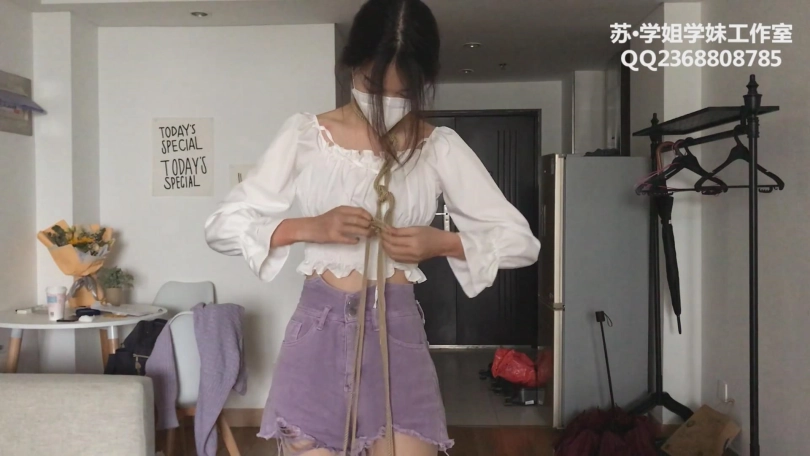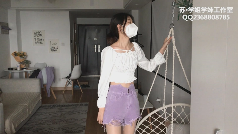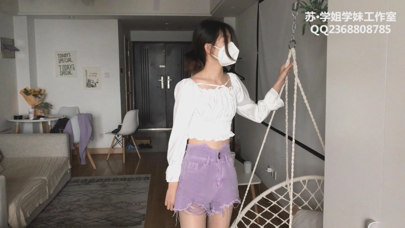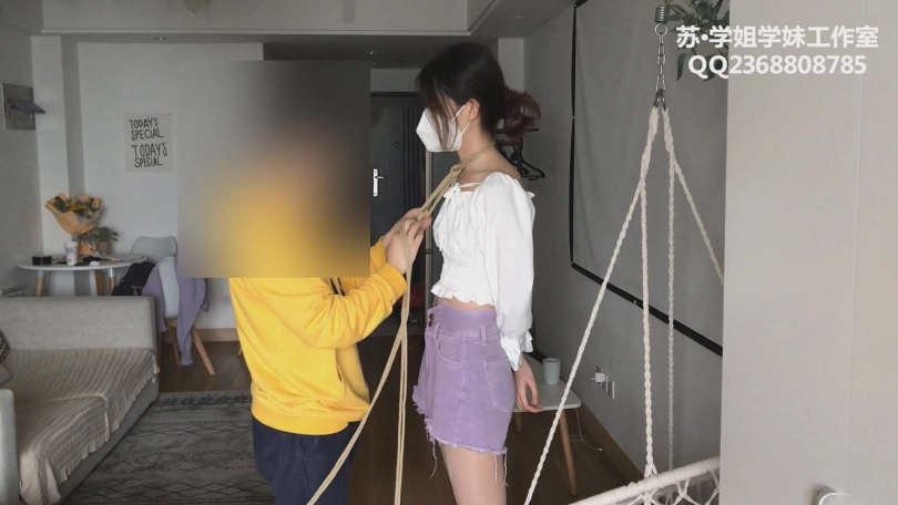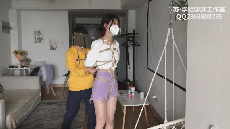 服装是超短裤+马丁靴+闪光肉丝+花边白袜。解语被绑完龟甲后,手臂被五花紧缚,又在沙发上桃缚挣扎,而后脱掉鞋子露出花边白袜,再次桃缚挣扎。