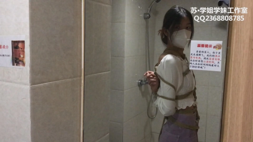 这是解语第一次体验龟甲紧缚。解语乖巧体贴的性格在这部片中体现的淋漓尽致,在绑龟甲和松绑时,她会主动用手按住绳结不让绳结被拽歪,还会帮忙递绳子。绑好之后,我带解语去卫生间照镜子,解语看着镜子里被绑的像个粽子一样的自己,点点头评价道,这个绑法确实挺有观赏性的。