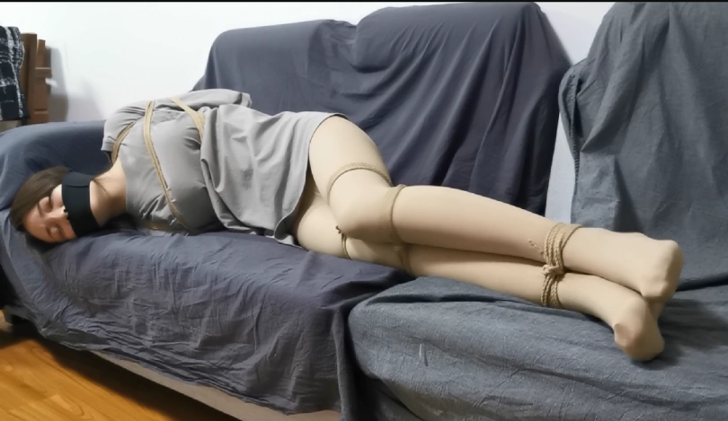 由于双腿被捆的太紧,小兔一用力,双脚就没有办法站稳,摔倒在了沙发上。挣扎着坐起来后。有奋力的挣扎了起来...。大约过了五六分钟后,绳上的绳子丝毫没有要松开的痕迹。