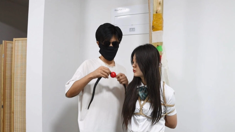 老板给秘书菲儿带来了一套JK制服,跟她玩一个小游戏。在办公室里菲儿被日式后高手直立吊起来,站在5本书上。老板说:这里有8道题,你要是答对了没有奖励,答错一题抽一本书,这些题都是中学课本上有的,今天来给你找找学生时代的感觉。然后老板给菲儿带上一个大口球,菲儿说你给我带口球我怎么答题。老板说:怎么带上口球就发不出声音了吗,刚才不是叫的挺欢的。然后开始答题,菲儿正好答错了5道题,老板把书全都抽走了,菲儿最后只能踮着脚被吊在办公室里。老板说一看就在学校没有好好学习,就留你在这里罚站好好反省吧。