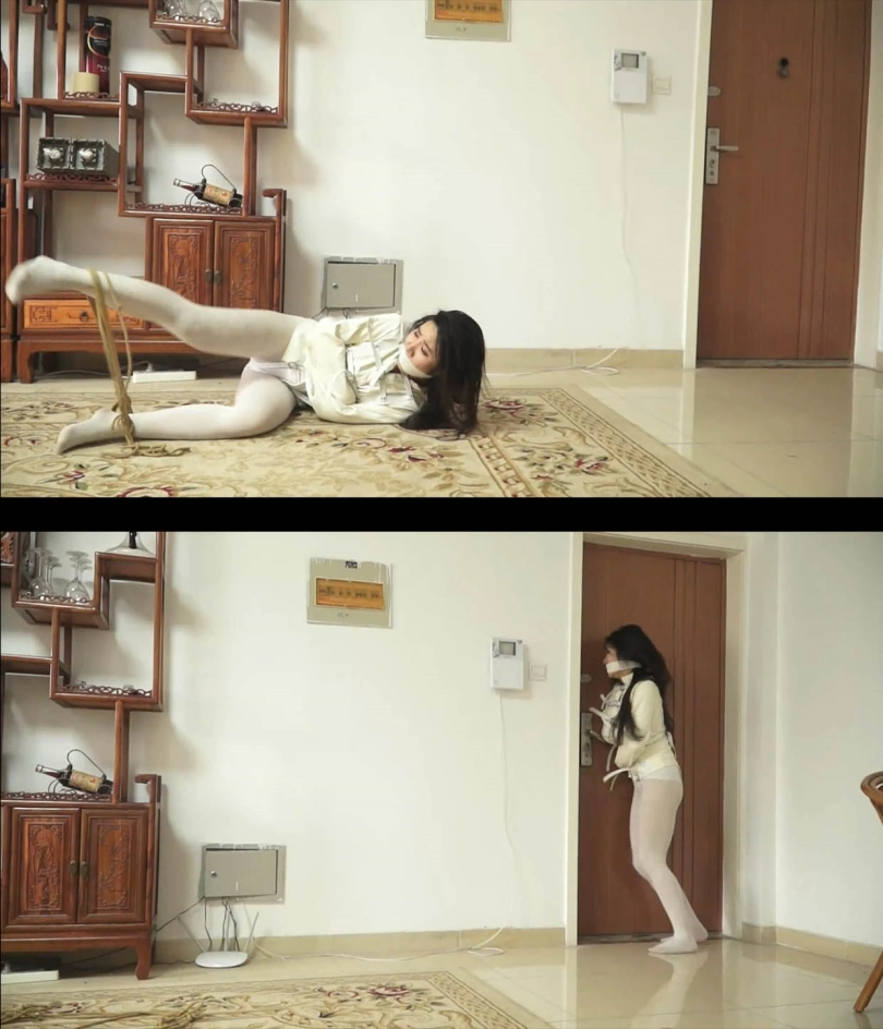 女警最后好不容易终于把脚部的绳子摩擦开了。但上身的拘束衣还在,她赶紧跑到门口,想逃走。