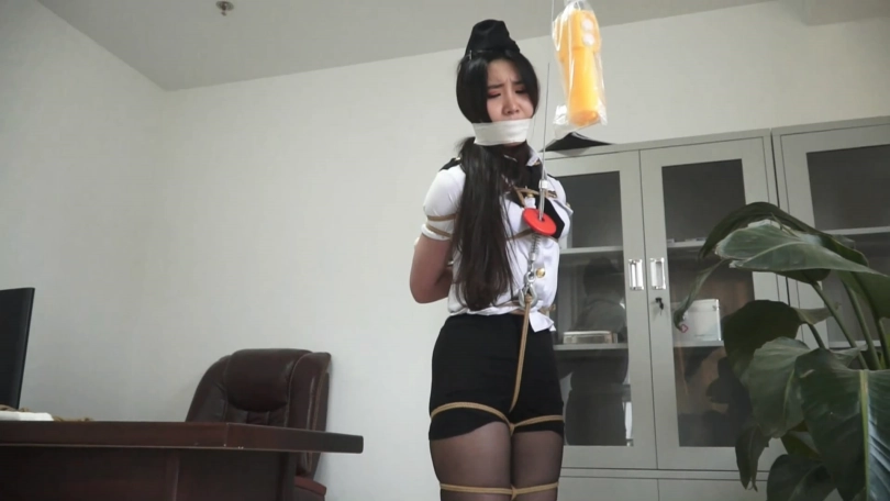 女警裆部被勒了绳子,垫着脚站立着,绳子无情的勒进她的蜜穴,刺激的女警呜呜直叫。