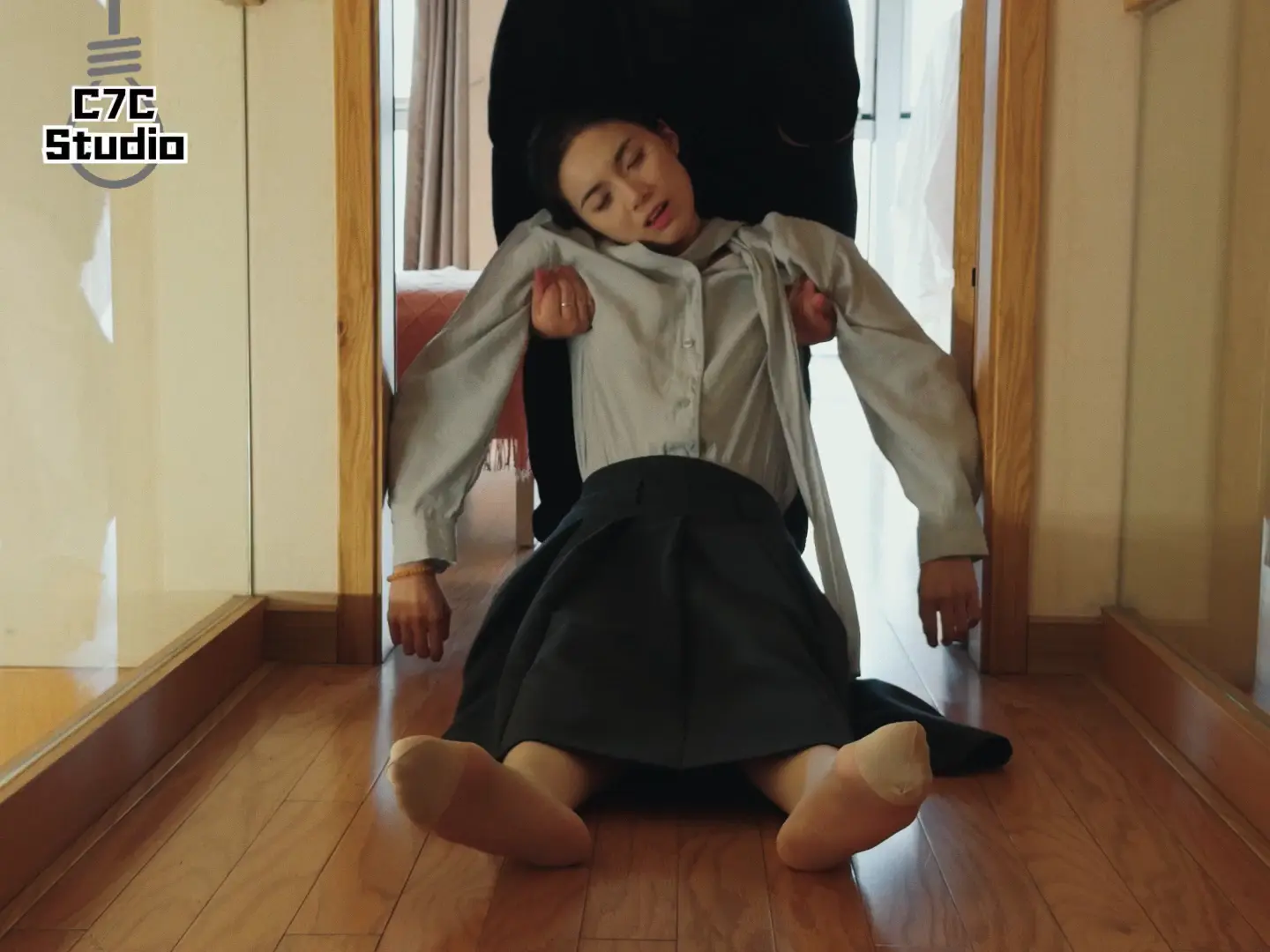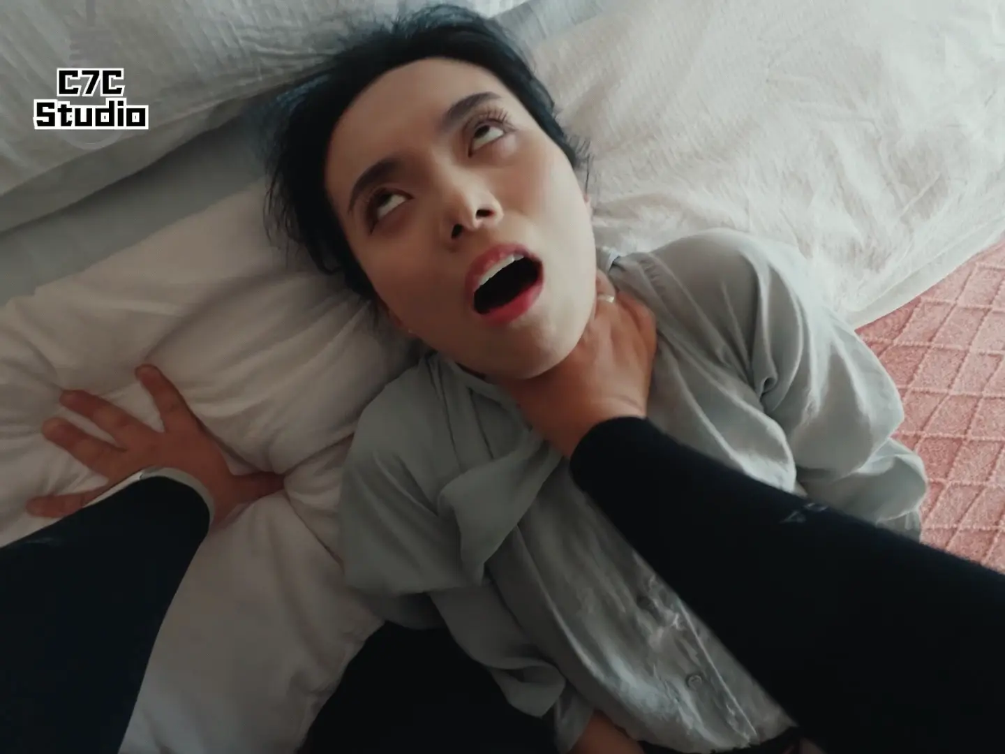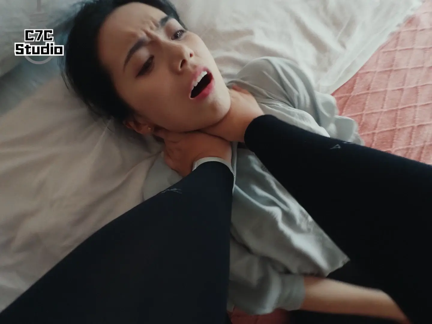 小姐姐下班后坐在沙发打电话揉脚,随后被入室的杀手闷晕,杀手将她拖到床上掐死,小姐姐疯狂翻白眼抽搐挣扎,死后被杀手玩脚