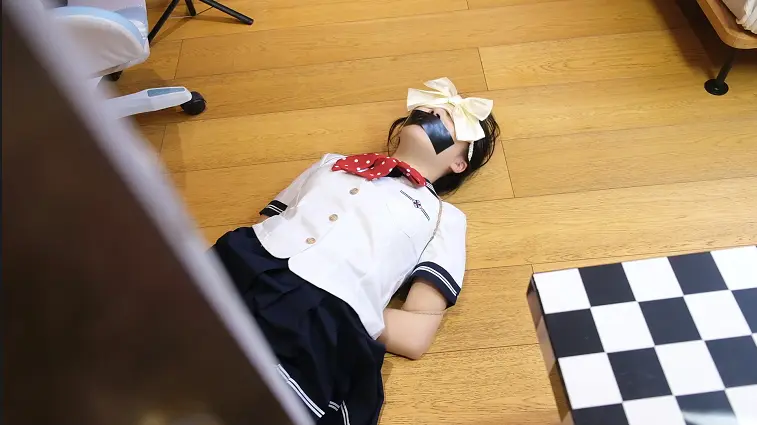 配音个女声:“手和脚都绑的好紧,还好我穿了丝袜,试试能不能把脚挣扎开,我要逃走”