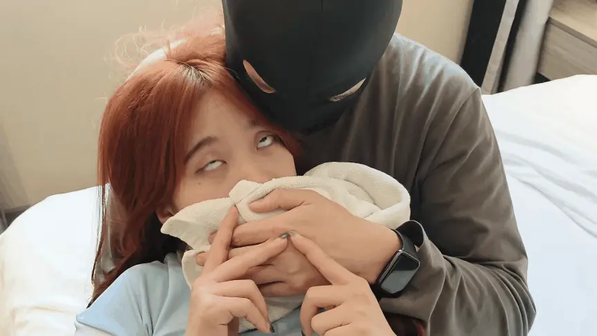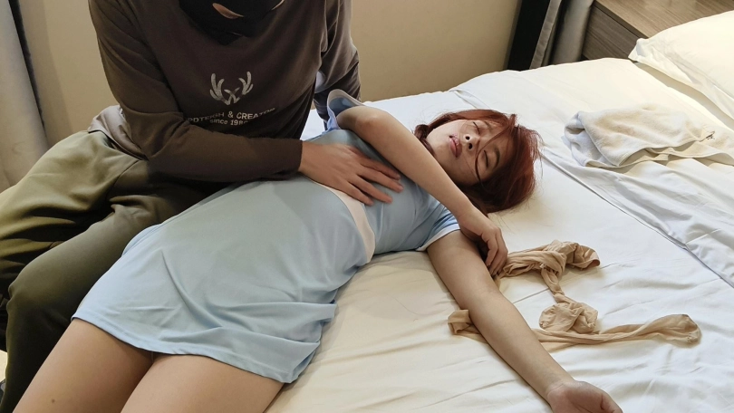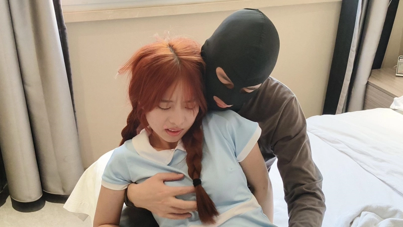 坏人A做了模特娜娜一阵子男朋友后突然想甩掉模特,这天他来找她提分手,模特不同意,死缠烂打,苦苦哀求不要分手,A变得不耐烦,突然拿出白布开始捂晕模特,模特立刻翻白眼(翻白眼时肢体开始挣扎,翻白眼时间越久越好)然后渐渐失去知觉,A立刻坐在模特身边,开始翻模特的眼皮,并不断摸她的腿,一会模特醒来(每次通过摸模特的耳垂后,模特可以立刻苏醒)看到A后开始说:“雅灭蝶,雅灭蝶,你是想干什么”A没搭理她继续摸她,模特这时开始喊救命并要站起来逃走,A将她拦住并摁倒在沙发上,然后捂住她的嘴巴,模特开始翻白眼然后晕死过去,这时A开始摆弄模特的身体,大概两分钟后模特苏醒(被摸耳垂后)看到自己被摸后开始喊雅蠛蝶雅蠛蝶,结果再一次被迷晕。(每次迷晕时都要翻白眼,时间尽快能拉长)模特晕过去之后,A拿出肉丝袜把模特的嘴堵上。过了一会模特醒来后,想开口讲话,A主动拿掉她嘴里的丝袜,模特说:求求你不要离开我,我什么都愿意做,然后主动将屁股对着坏人(模特自己掀起裙子,撅起屁股朝着坏人)说你可以随便摸我哦,A同意了直接上手抚摸模特屁股。然后过了一会模特说:你能不能给我揉下脚,然后A开始给模特揉脚,揉来揉去最后用力捏了下,模特顿时疼得翻白眼然后晕了过去。然后A继续揉模特的脚,摸模特腿,一会模特醒过来,想穿上鞋子逃跑,被A从后面抓住并再次用手帕捂晕然后拖到了床上,并开始摸模特的屁股。过了一阵子,模特,醒过来说:对不起我再也不敢了,然后主动拿起毛巾捂住自己的嘴,翻白眼后晕倒在床上,全剧终。