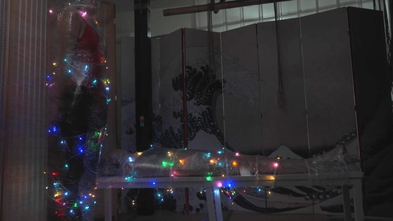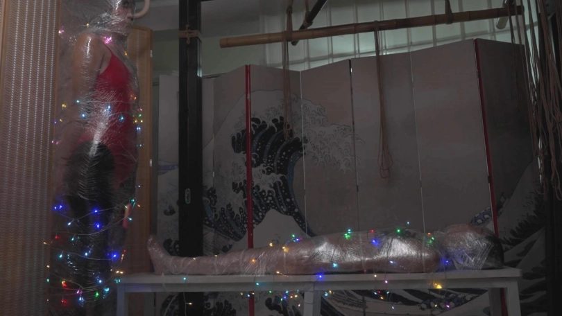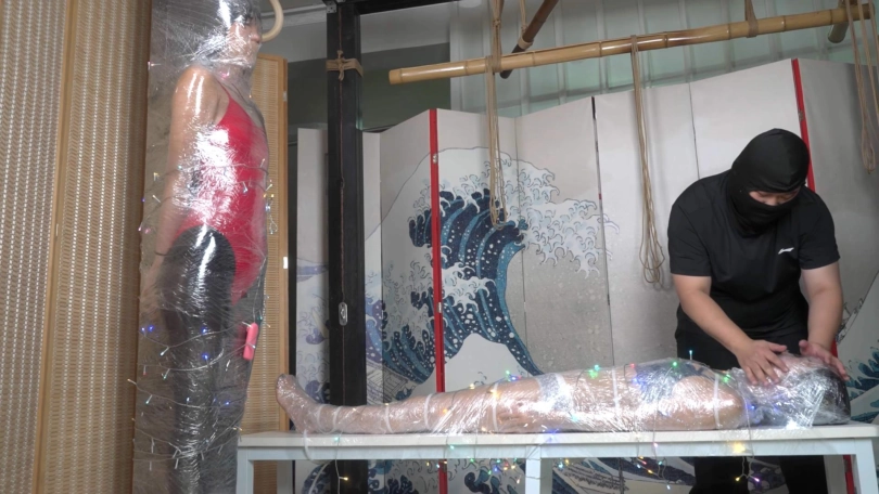 于是嗷嗷成为了月亮的圣诞礼物。她将礼物用保鲜膜和扎带打包束缚起来,用TD玩弄她,TK她的双脚,抚摸她的身体。最后月亮和象人一起把嗷嗷束缚在一张桌子上,并用彩灯点缀她的身体。