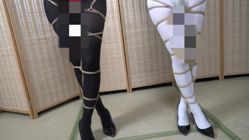 月亮和嗷嗷都被绞刑捆绑起来,双腿被塞入了粗大的震动棒,穿着高跟鞋的双脚交叉绑在一起。象人让她们比赛谁能坚持更久。最后还脱掉她们的鞋,增加她们的挣扎难度。最终是月亮获胜。