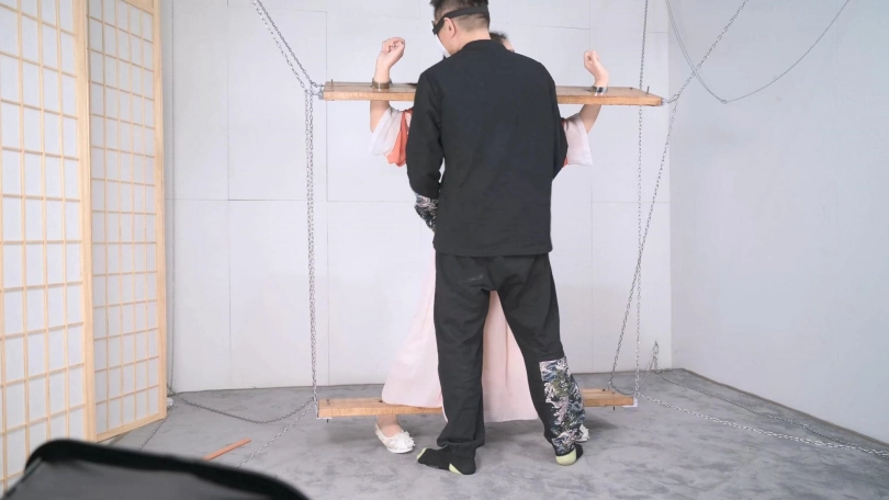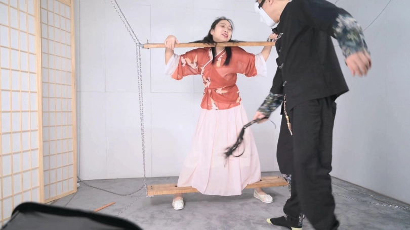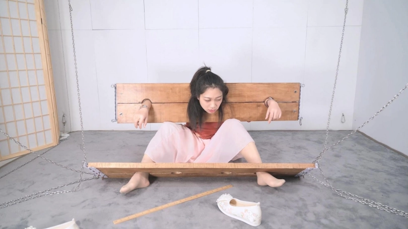 这套古装好似有魔力一般,沐小雨穿上就像戏精附体,表演欲爆棚,我这老演员都差点没接住,微剧情有点意思,不做过多介绍。单说这木枷组合,头一次用铁链连接吊起,固定作用明显,还有足够活动空间,据说古代犯人带着木枷时间过长,能够被活活卡死,我不太相信!于是顺着她的剧情,把沐小雨和木枷一起解下来,还真让她找到了求生姿势,就不知道如果戴着我这套厚重木枷能坚持多久了。