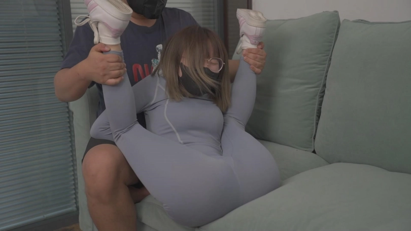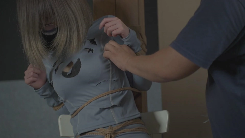 蒙面人入室对嗷嗷掰腿折脚。将嗷嗷绑在柱子上一点一点剪开她的衣服。最后准备开始享用。