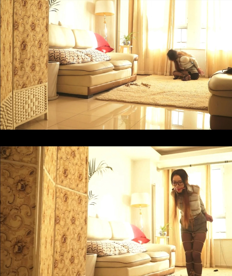 美女刚跳到门口想开门,刚开门坏人回来了,坏人把她又抓回房间,可怜的美女玩命挣扎,但被捆绑成人棍的她根本无法反抗。