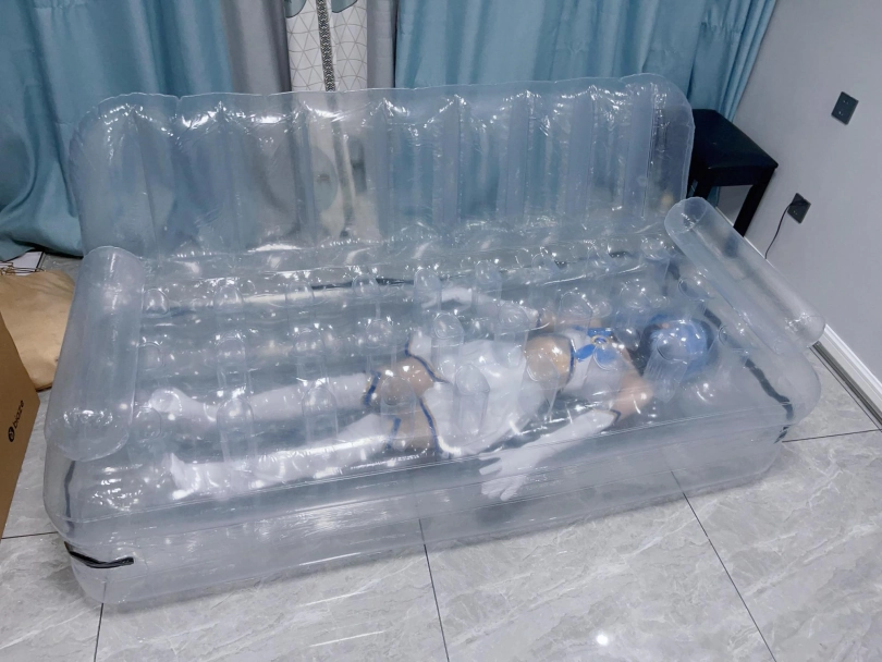 充气沙发没有换气孔,只能类似真空袋一样,呼吸残余的空气,控制氧气呼吸,十分闷热~