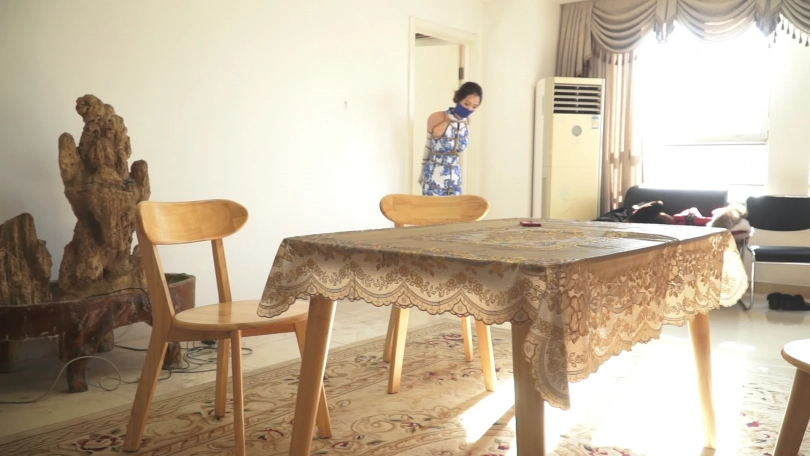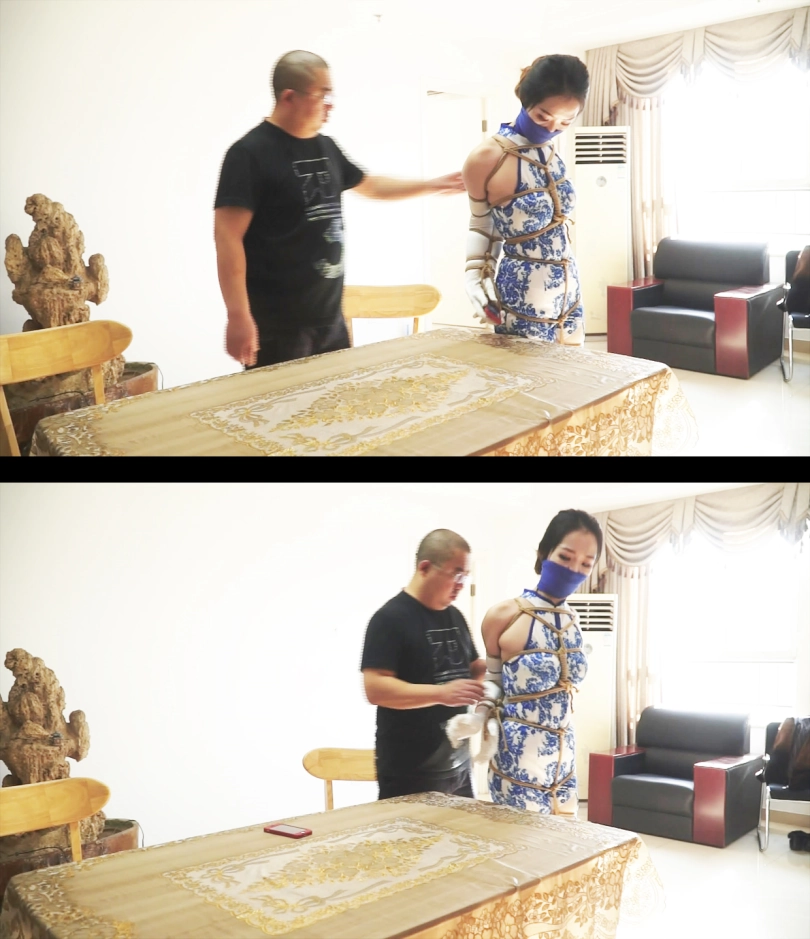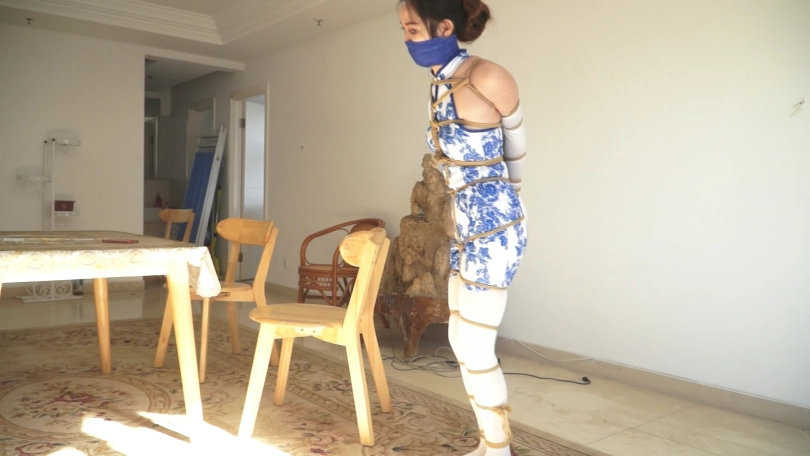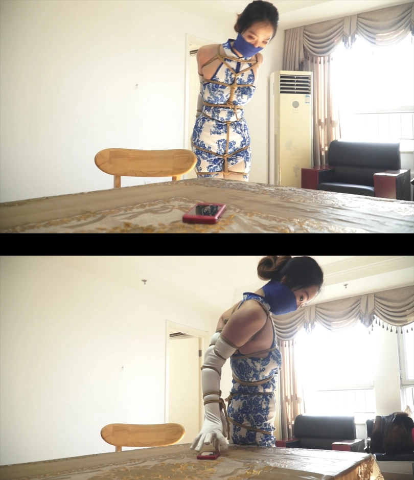 上集说到被吊缚的旗袍白丝美女经过努力的挣扎,终于逃出了自己被吊缚的房间。