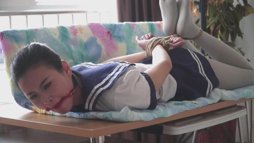 美丽的女教师文慧从昏迷中醒来,发现自己被紧紧地捆绑,嘴里还塞着自己女学生施若的原味肉丝袜。施若走了过来,解开自己嘴部的束缚,然后把刚从嘴里解下来的还沾着自己口水的丝袜勒到文慧的嘴里(一镜拍摄,没有剪辑,非常带感!)。施若抚摸了一会文慧的黑丝美腿,然后离开。文慧在房内疯狂地挣扎。终于,她用自己的丝袜脚夹到了一把小刀,割开自己的束缚。就当文慧打算解开蒙嘴的布条时,施若来到客厅。文慧拿起桌上的一个苹果冲上去塞到施若嘴里,然后将施若捆绑。接着,她解开蒙嘴的布条,又拿出了嘴里沾满口水的丝袜,用这条丝袜套住施若的头,还给施若塞上口球。