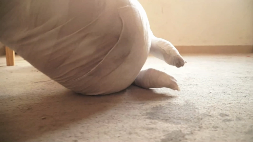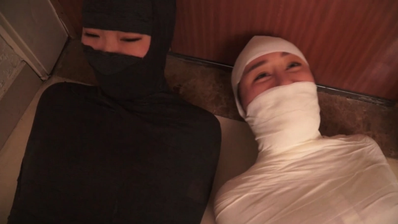 之后2个被包裹的只露眼睛的木乃伊美女的各种挣扎,互相磨蹭,累的全身香汗淋漓。