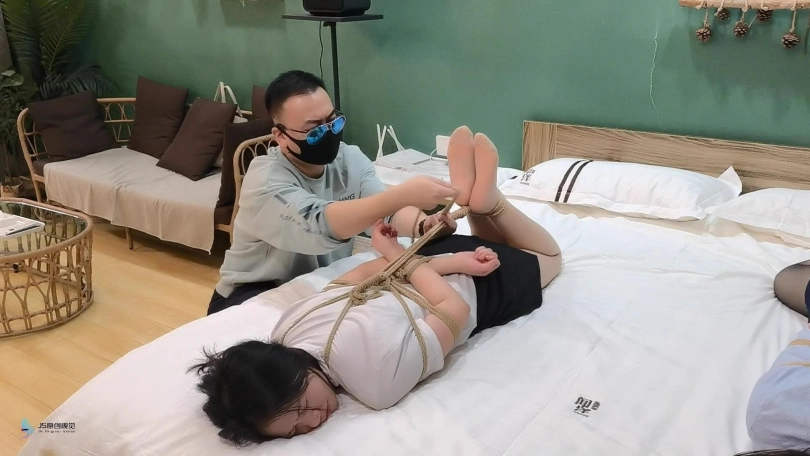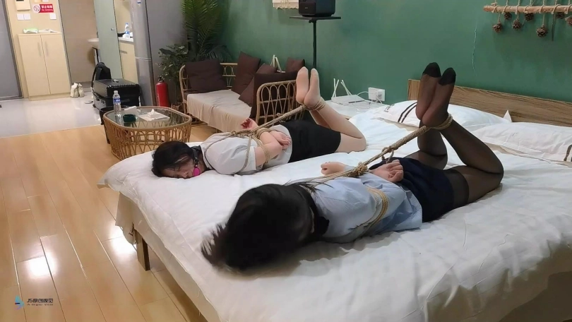 一对姐妹回到家中休息,一名劫匪潜入房间,将休息中的她们驷马捆版捆绑起来。一个女孩被塞着口球,另一个女孩嘴里被塞进丝袜。过了一会,劫匪给她们换了一个姿势,彼此的脚对着对方的头部捆绑在一起,让她们闻对方的丝足。女孩不断的挣扎,呻吟着。