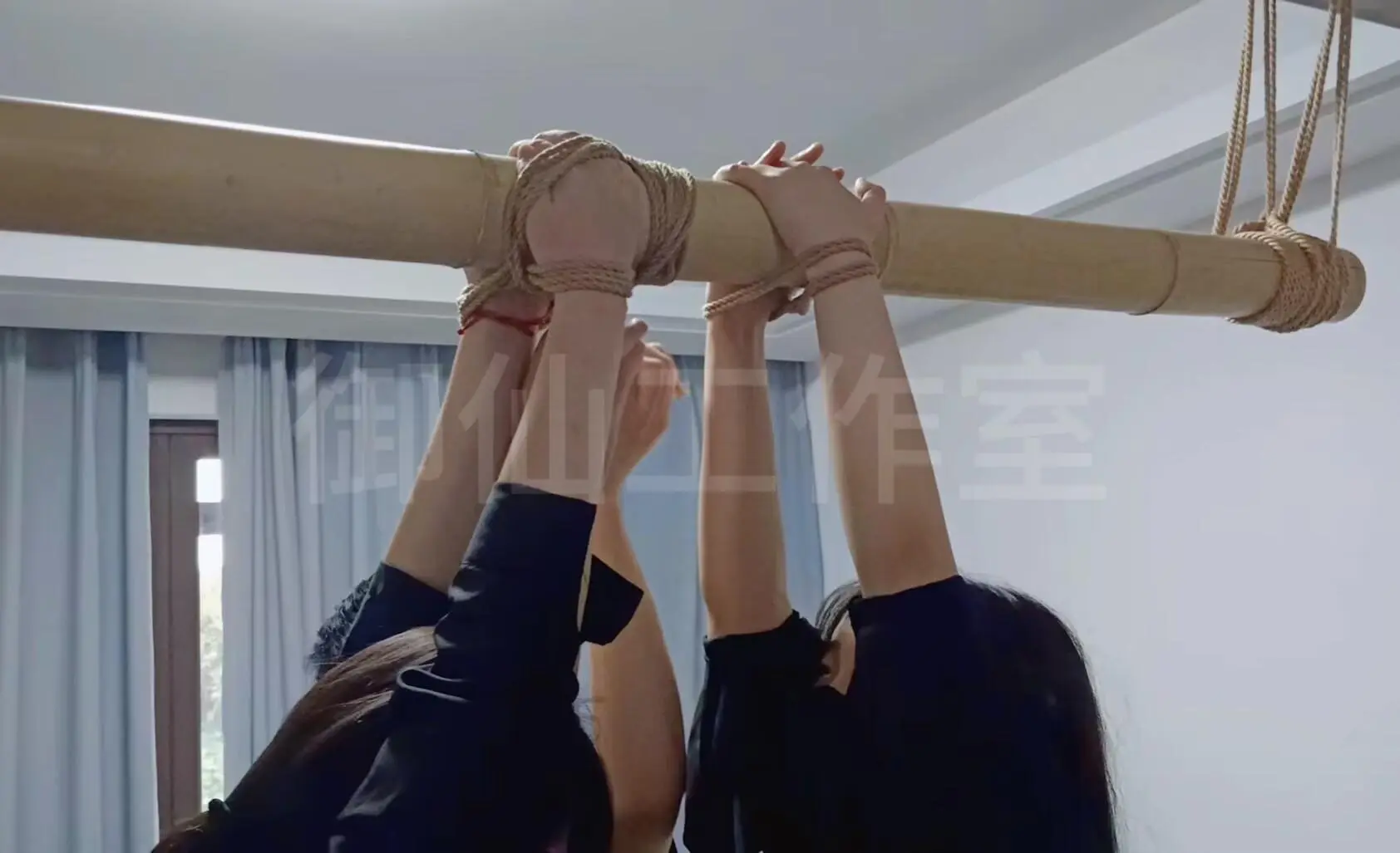 比赛形式的走绳比赛,在绳子上打结,然后模特们在绳子上行走,摩擦[X_X]带来[X_X]。