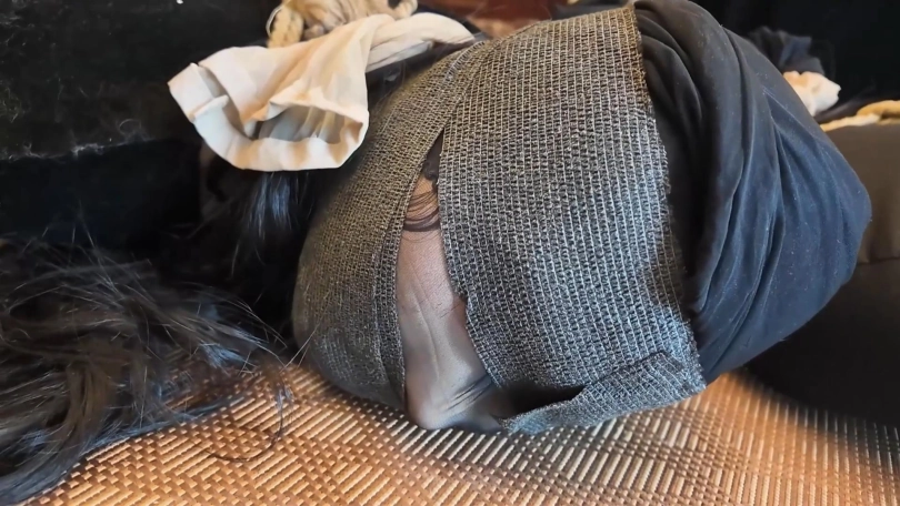 绑匪分别用丝袜套住她们的头,并堵嘴蒙眼。将她们带走。