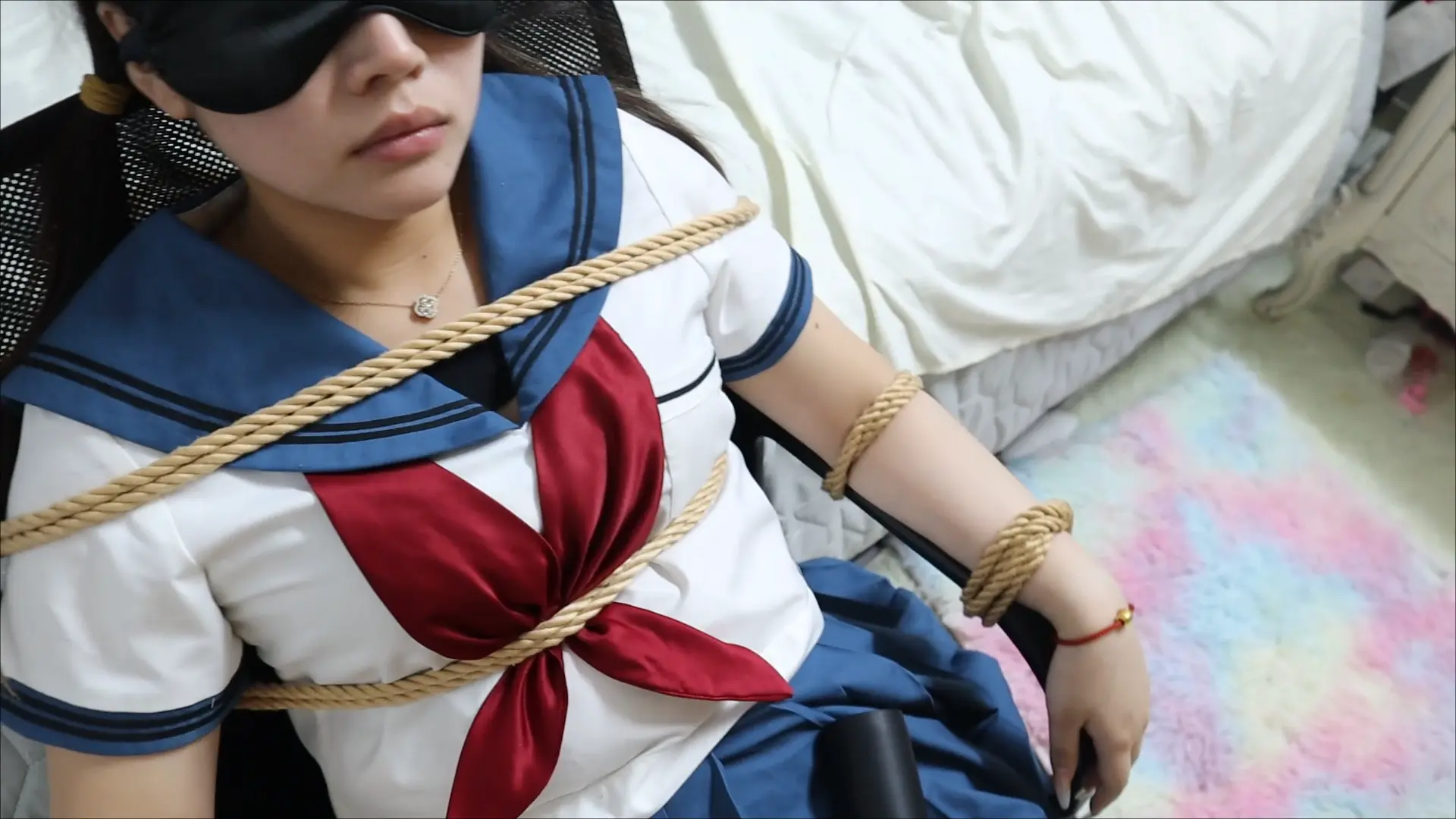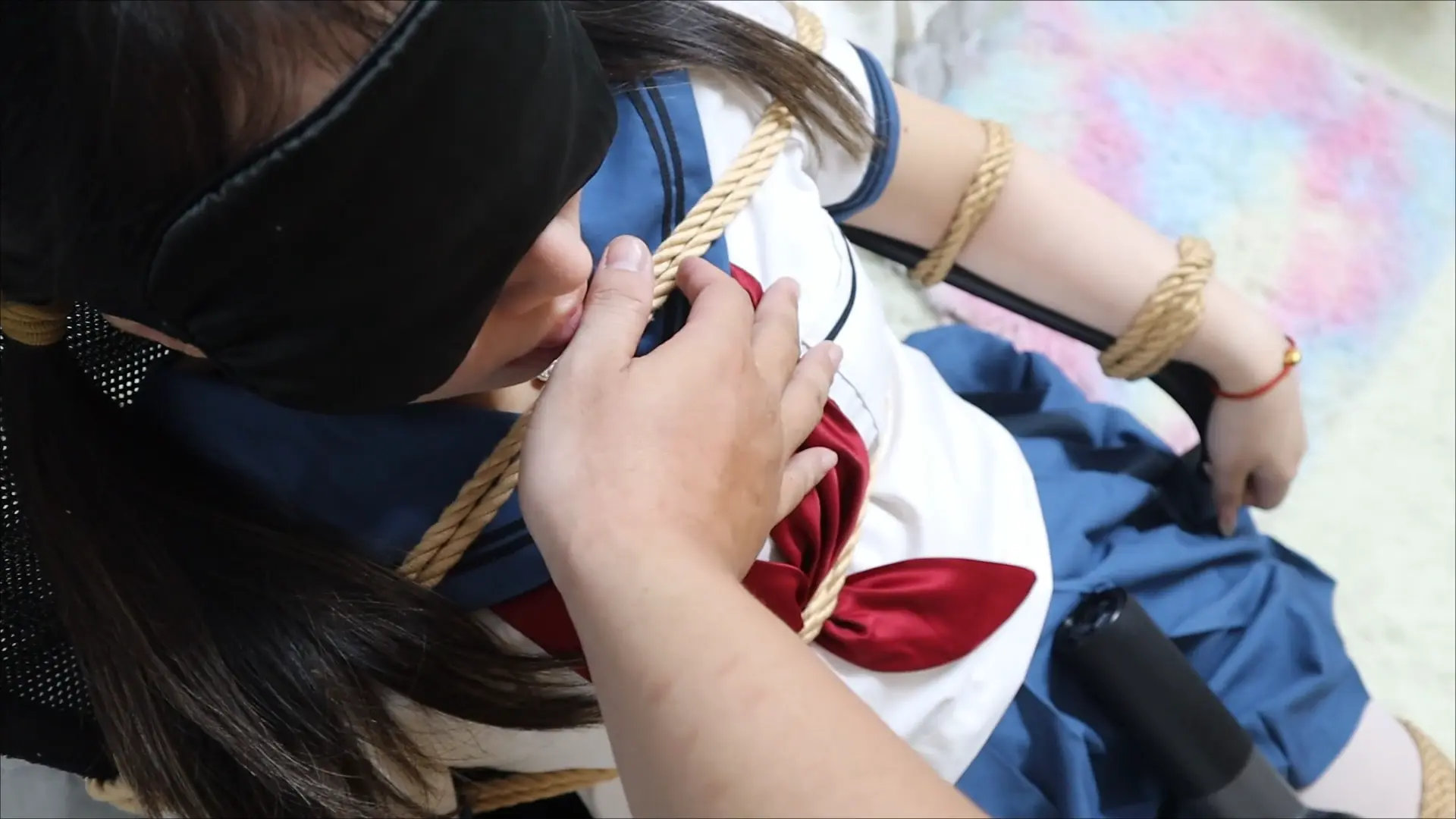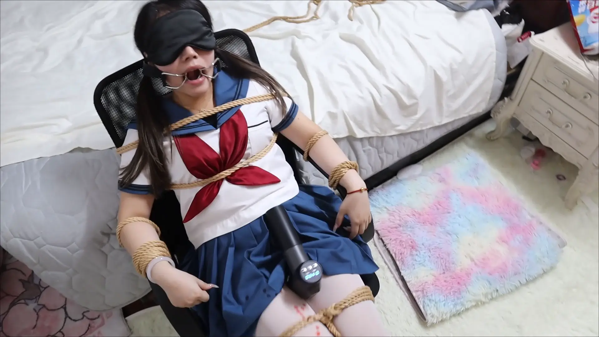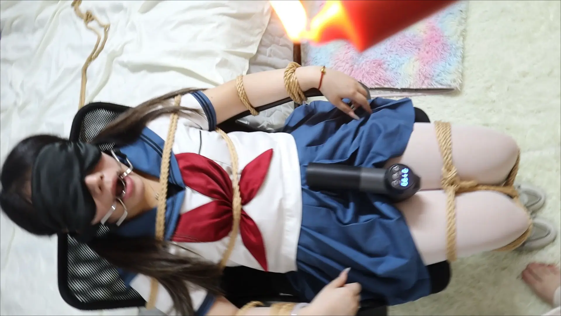 清纯水手服萝莉椅子捆绑凌辱口枷亵玩,滴蜡在萝莉的身体上,
