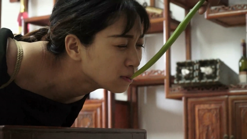 老张从厨房拿来一根青葱,对王蕾说,本想喂你吃些水果的,可是家里没有了,你就凑合着吃吧。