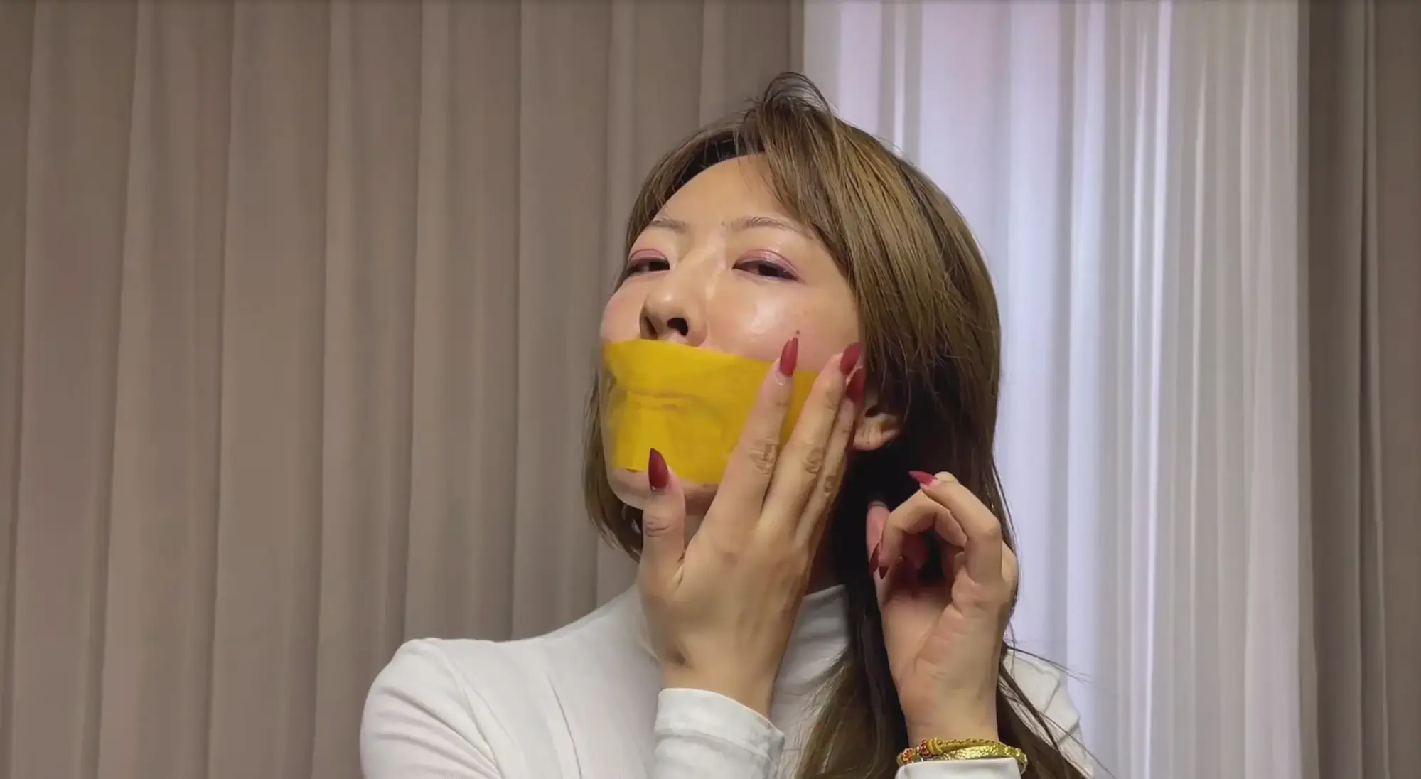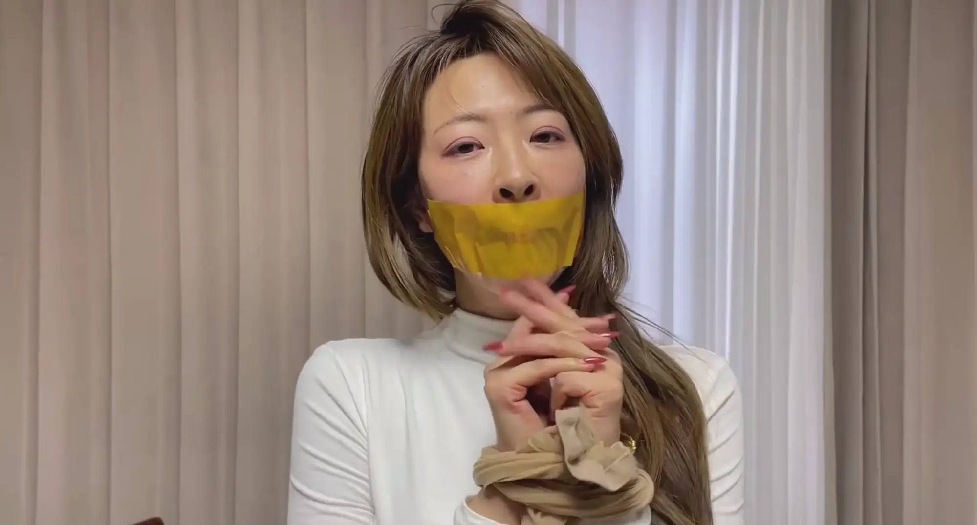 拿出黄色胶带贴合好在自己的嘴唇上,然后用丝袜把自己手正面绑住。