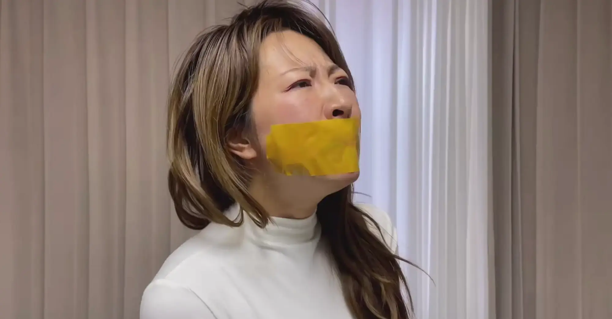 劫匪走开前,撕下一截黄色胶带贴住小米鼻子附近(不要太假),同时扯下白丝,蒙住一层肉色丝袜。“这是特制的丝袜,让你没法呼吸!”说完就开始寻找钱,小米抬手,挣扎半分钟后扯掉了蒙面丝袜。