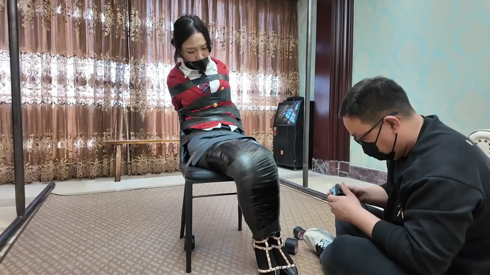 快递员用胶带把芷兰绑成了一个木乃伊固定在椅子上