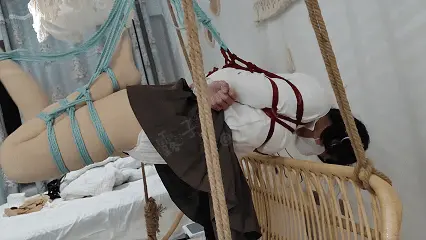 露露白天穿了一天的棉袜被无情塞进嘴里后被马具口塞堵住无法吐出,眼睛被蒙享受坐在吊椅上荡秋千的感觉。