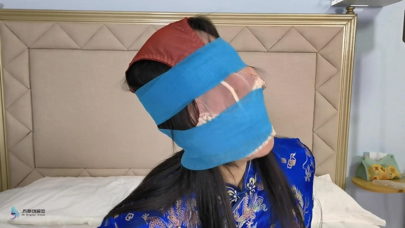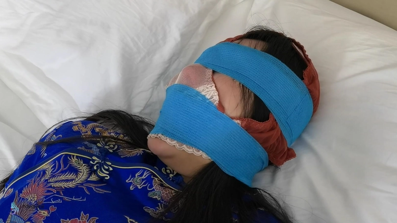 内裤套头,眼、口处胶带固定。展示过程。