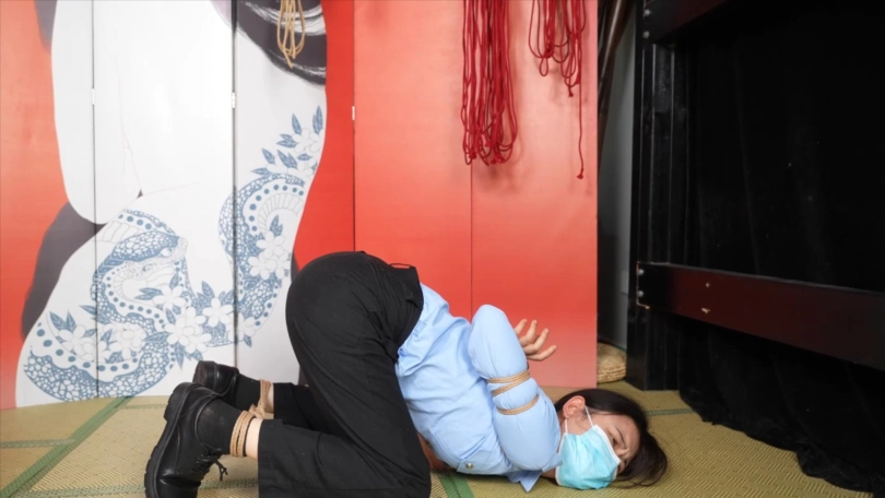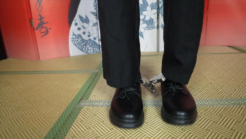 小0戴上镣铐展示,然后被直臂驷马挣扎