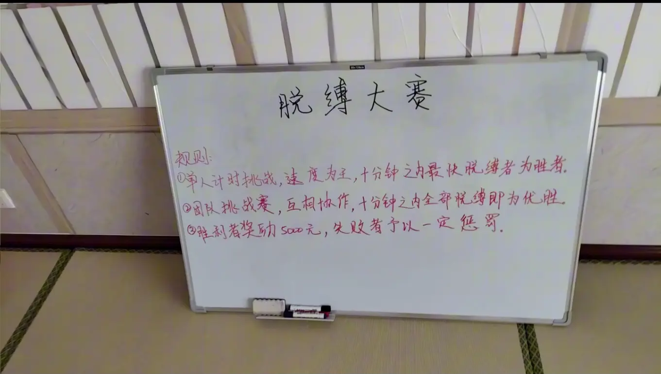 共三位美女参加(林晓雅,李伊可,玖儿),分为两部分:第一部分,个人竞速赛,同样驷马造型,速度快者优胜,慢着惩罚。第二部分,团队脱缚赛,在规定时间内完成则为优胜,未完成视为失败,予以惩罚。