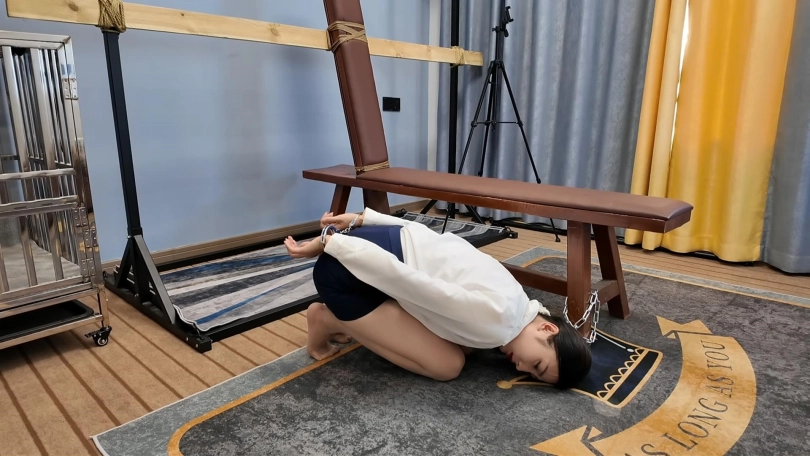 公司白领佳佳在家沙发上休息,被入室歹徒绑架折磨,绑到椅子上面墙高,多次墙高之后又把她关到笼子里面,带上铁链,拴到凳子上,最后逼迫她换上豹纹裙子开始下一轮的折磨