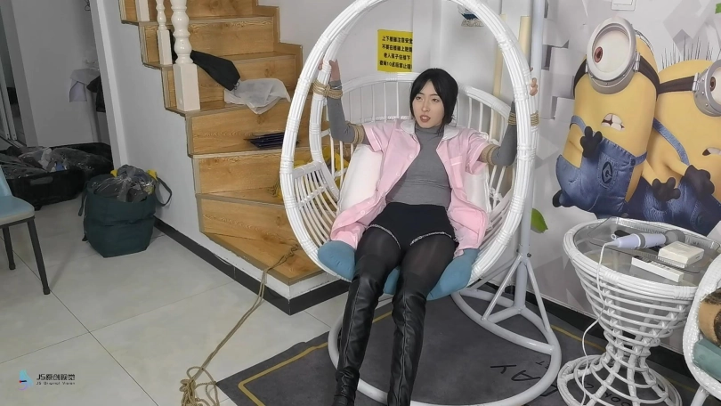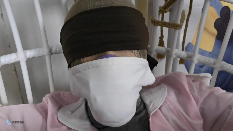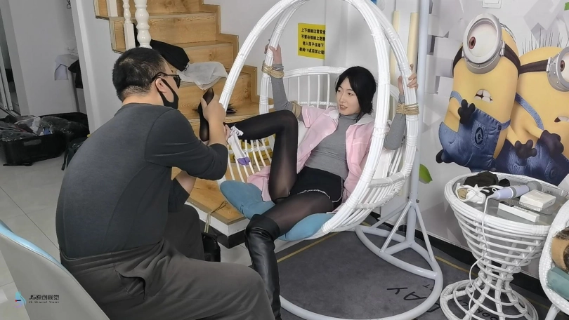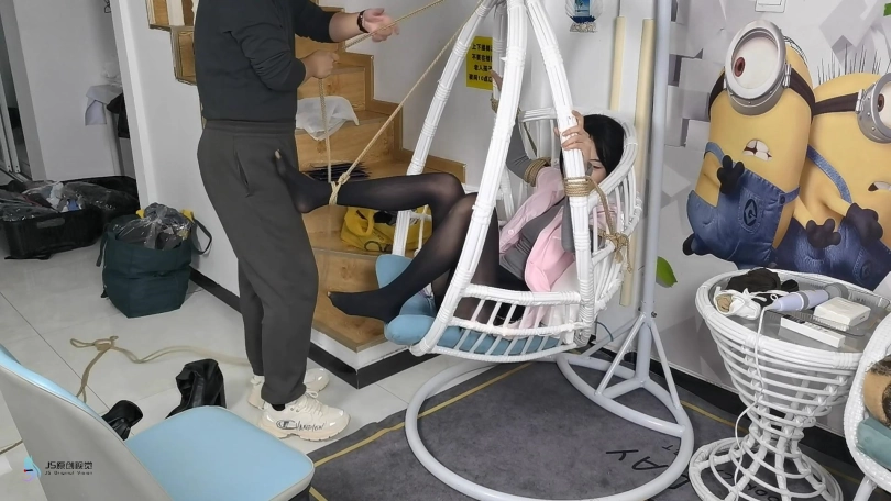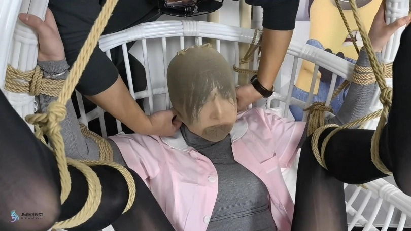 男人将护士绑在里一个吊椅上,脱下她的靴子,亲吻着护士的丝袜美足。男人从衣柜里拿来护士没洗过的丝袜,塞进了她的嘴里,套上丝袜头套,胶带缠绕防止护士吐出嘴里的丝袜。将护士穿过的棉袜放在她的鼻子上,外面戴上口罩固定。用一条丝袜蒙住眼睛。男人开始用棒棒刺激着护士。女护士在这样严密的封堵下只能发出微弱的呜呜声。