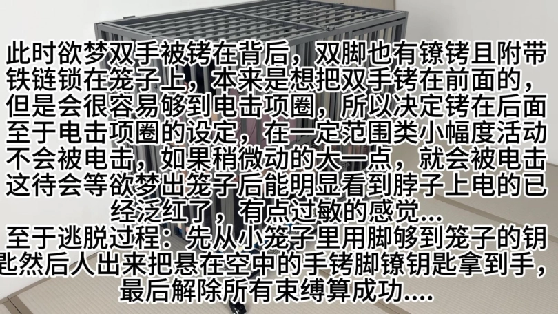 2:欲梦被手铐脚镣锁在一起并用铁链限制手和脚的动作幅度,PY被塞上电击肛S(肛S会运行15~20秒然后暂停 5秒如此循环)要求在有限的时间内解开并拔出肛S。
