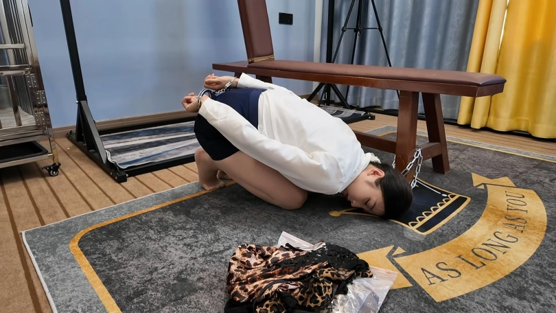 佳佳带背拷,脖子拴着铁链,头按地,固定到老虎凳椅子腿上,这个姿势非常难受,头一点也抬不了,歹徒拿来一套豹纹裙子和豹纹吊带袜,命令佳佳穿上,玩SM游戏,爽了就放过她,无奈佳佳换上性感的豹纹套装,带上项圈,被像狗一样牵着,打屁股,当脚垫,遛狗,最后被绑到老虎凳上强制高,,两个棒棒一起,佳佳被高潮了无数次,叫声一波又一波