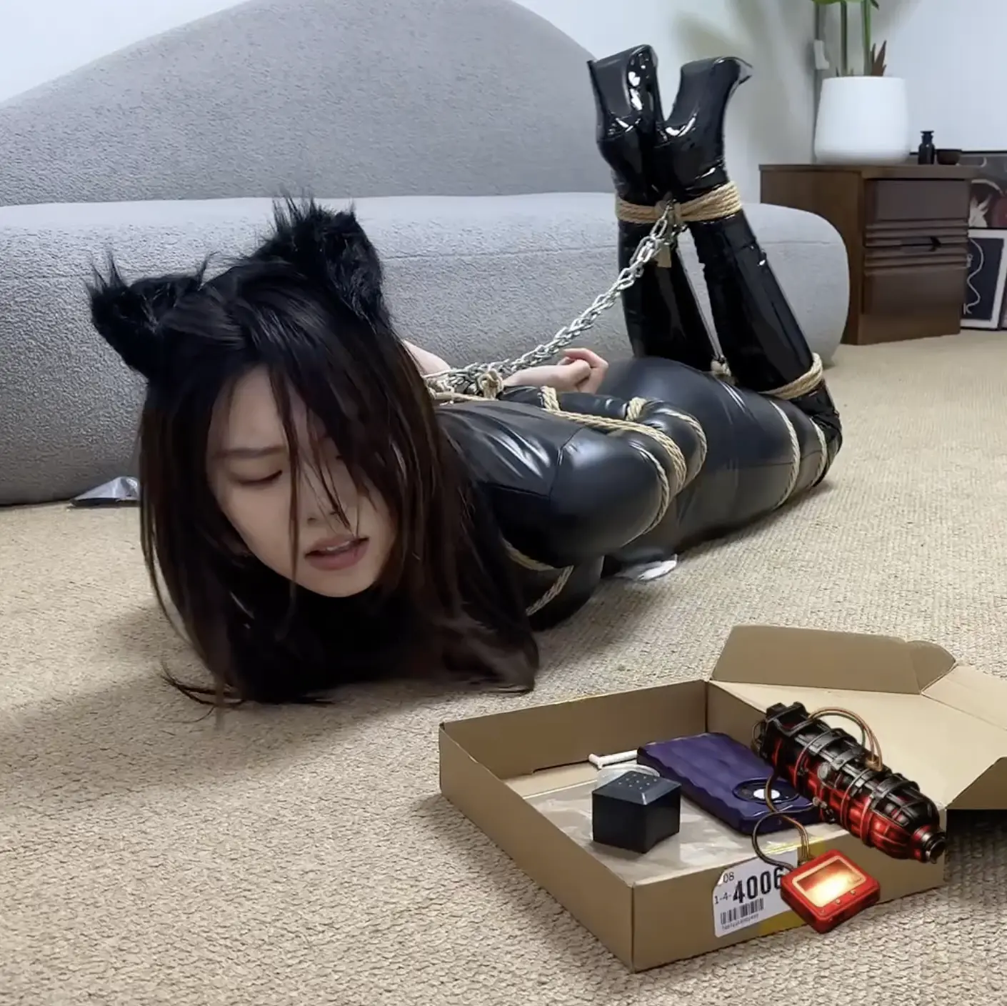 盖盖身高足有176,身形健美凹凸有致,脸蛋清秀冷艳,英气十足是圈内少见的霹雳娇娃类型!为新人设计了较简单的纯捆绑挣扎+放置挪动剧情,盖盖表演得超级卖力,和绳索的对抗力度十足,铁链驷马加身后的匍匐颇为精彩,最后的绝望哭泣更是反差拉满极其动人!这样的长腿御姐和清纯萌妹金宝还有很多,都靠从业多年的老板娘调教有方