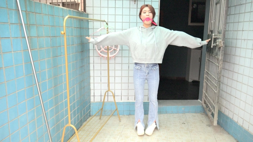 男子拿来一个长杆,将娜娜的双手手腕分别固定在长杆两端,双腿则并拢捆绑(口球不摘,一直戴着)。接着,男子将长杆用绳子固定在一个地方,这么一来,娜娜便被呈十字形拘束在那里。