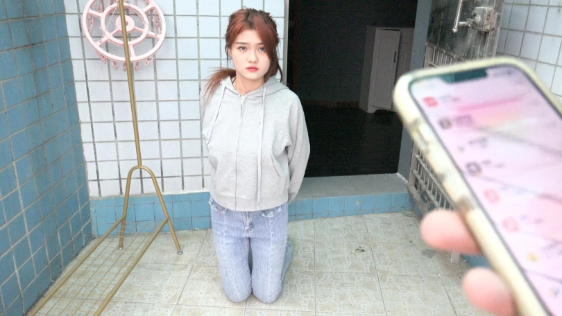 场景2:娜娜跪在地上不停哭泣,乞求男子放了她,可是他怎么会同意这好不容易才到手的“猎物”呢。只见他坐在那里,用棍子挑起娜娜的下巴,说:“在这里,你只有听话才能活命,你要是不想活命,我现在就成全你。”