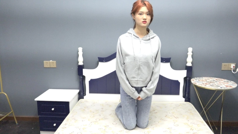 男子打量着娜娜的动作,脸上浮现出邪恶的神情。她开始纠正娜娜的动作,并要求娜娜将五指并拢伸直,指尖要翘起来。并且胸要挺出来,双脚并拢(体罚过程拍全身)。