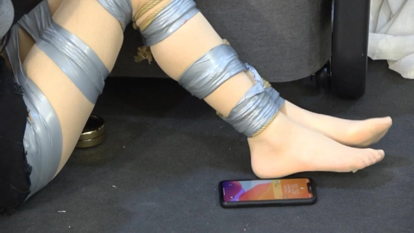 穿着牛仔短裤的小狐狸被绳子加胶带紧紧捆绑全身,她试图用自己的肉丝美足把自己装在包里的手机够出来,以便打电话求救逃脱,下场却是驷马惩罚,双手合一被胶带紧紧抱住。