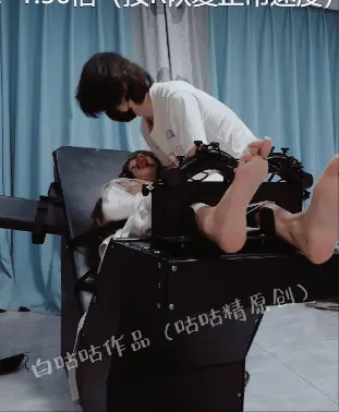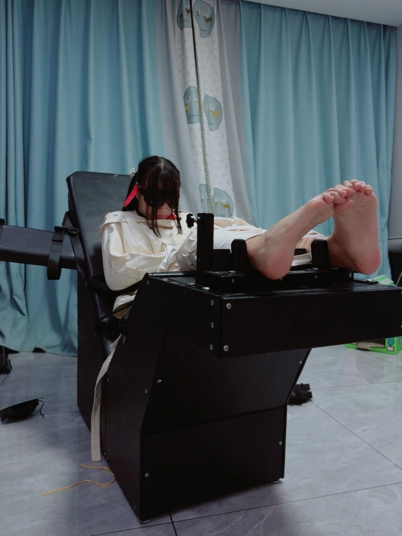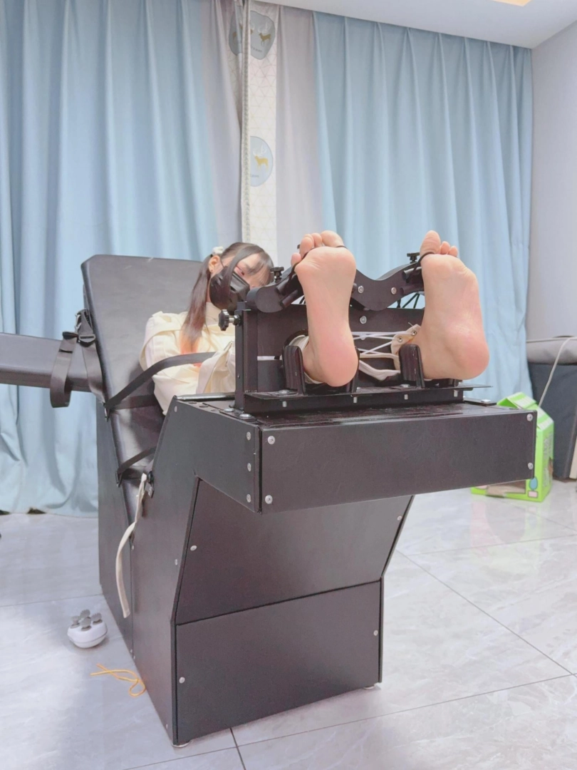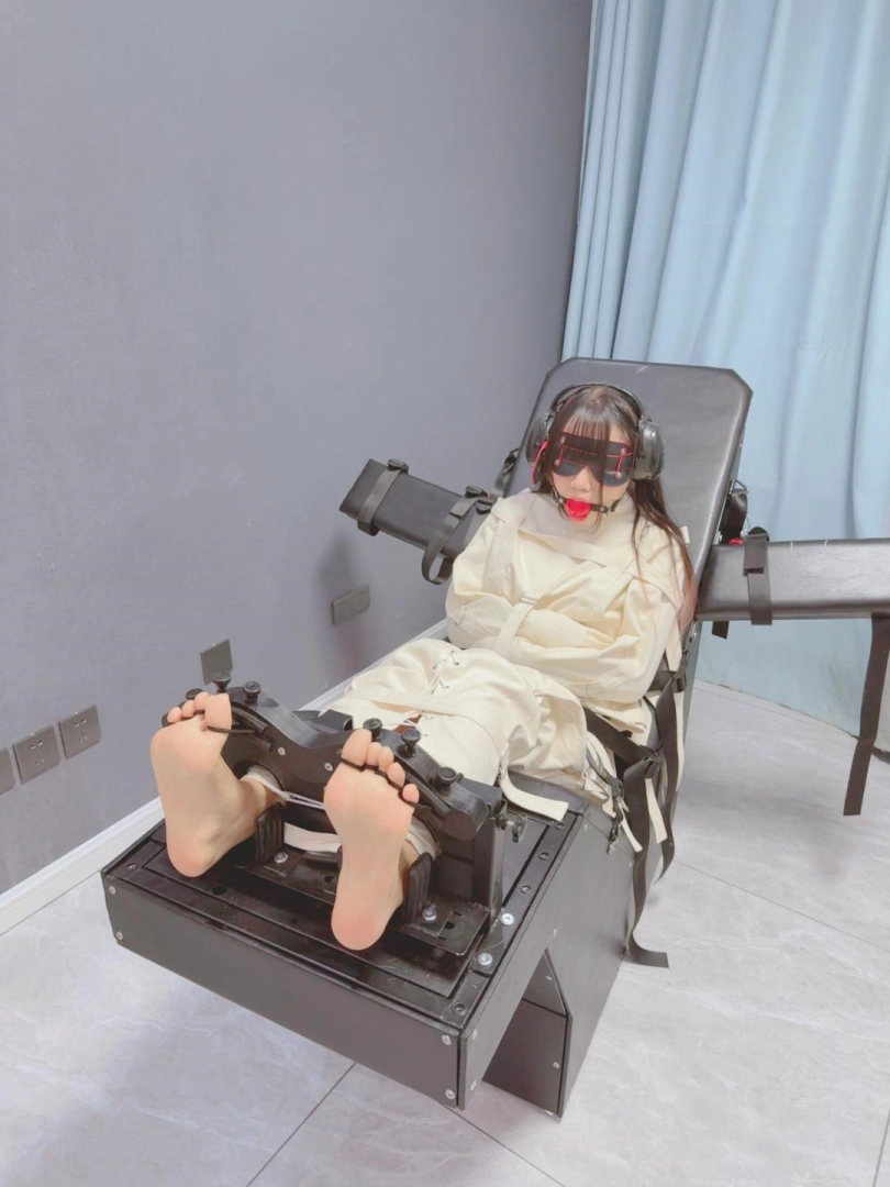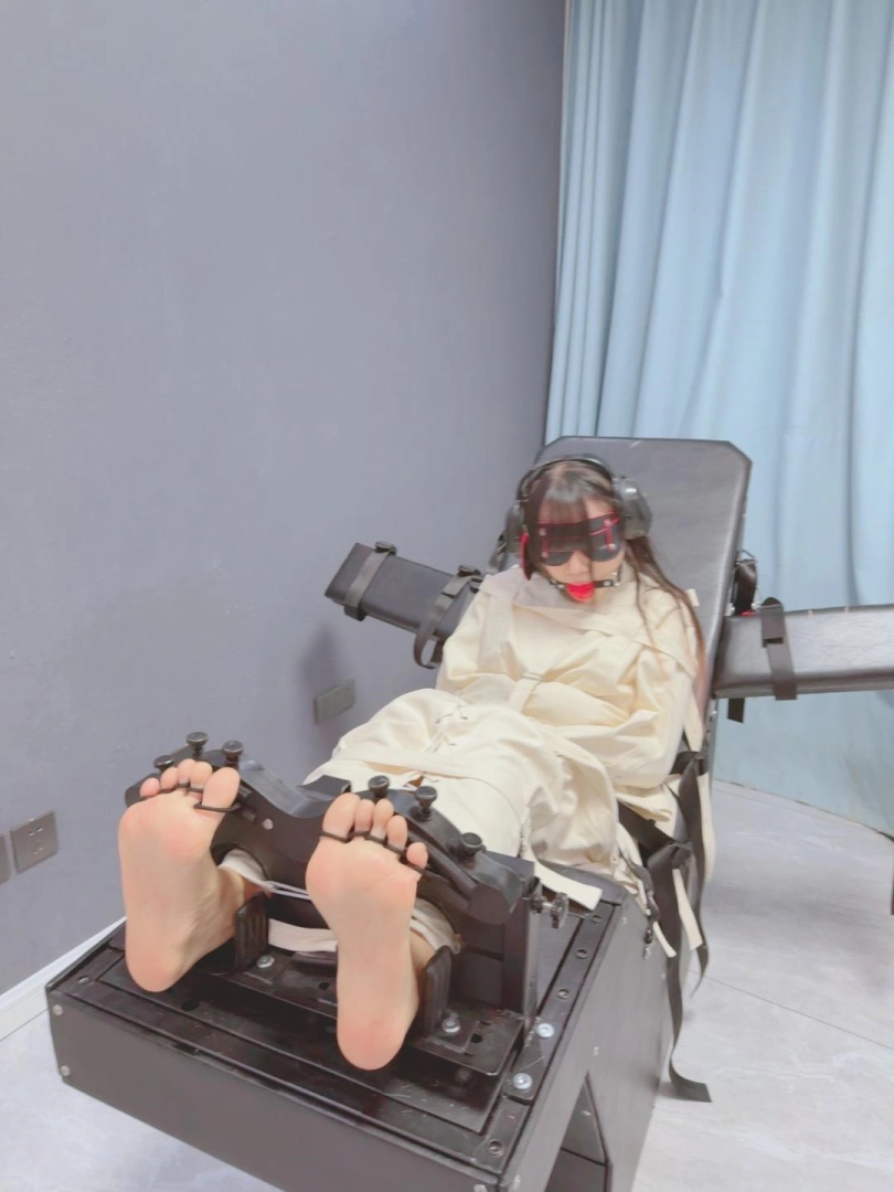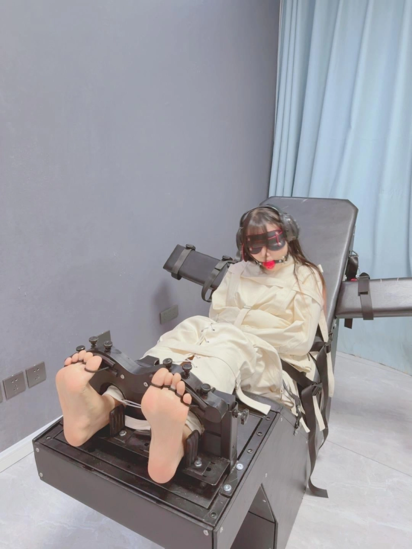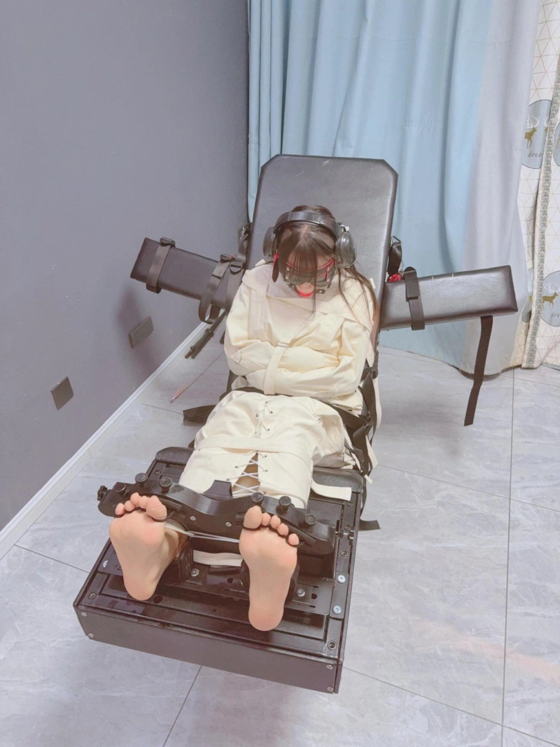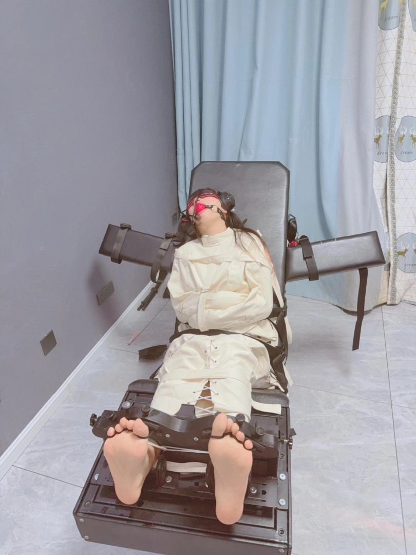 拘束:全套帆布拘束衣+拘束束腿,只露出脚底,然后把糖糖固定在刑床上,锁上重足枷,用束缚带加固固定在重刑床上。足枷固定脚趾,整个脚底被迫顶起来,一丁点都动弹不得。