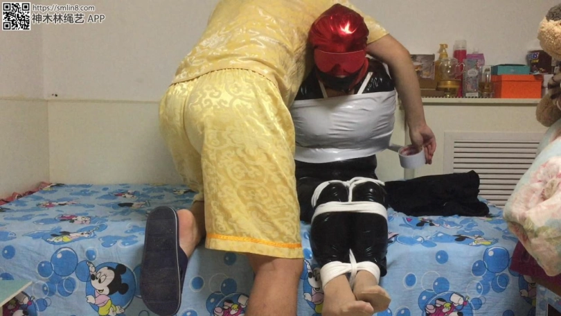 把妖妖捆绑后,本来是想用口塞堵嘴的 但是她嘴太小含不住(樱桃小嘴哈),没办法了,反正蒙着眼睛看不到