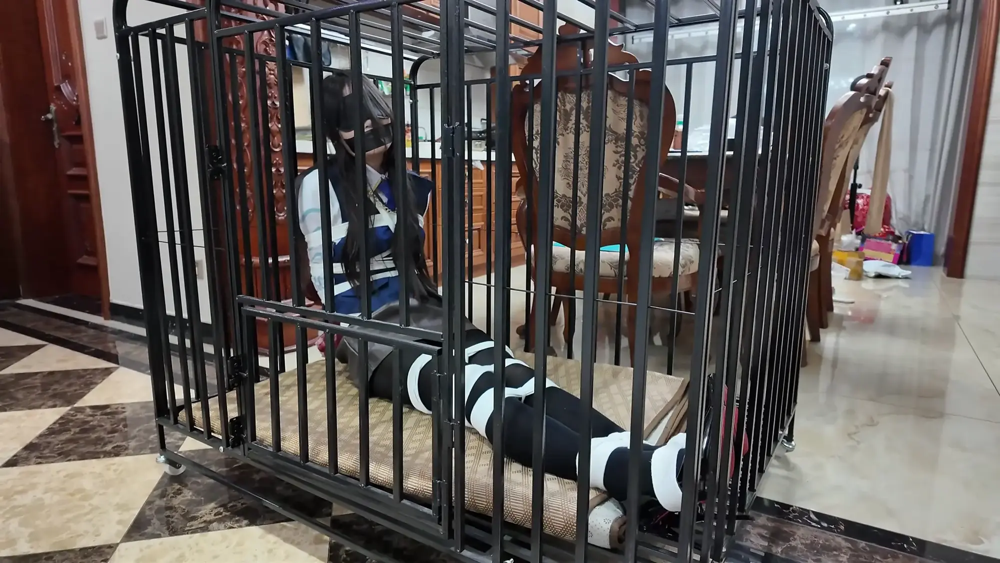 玩完雨琦后,米粒粗暴的把雨琦拖进笼子里说:这是专门为你定制的,花了我不少钱呢,你就好好呆着吧。说完就走了。雨琦眼睛被蒙住了,吓得不停挣扎