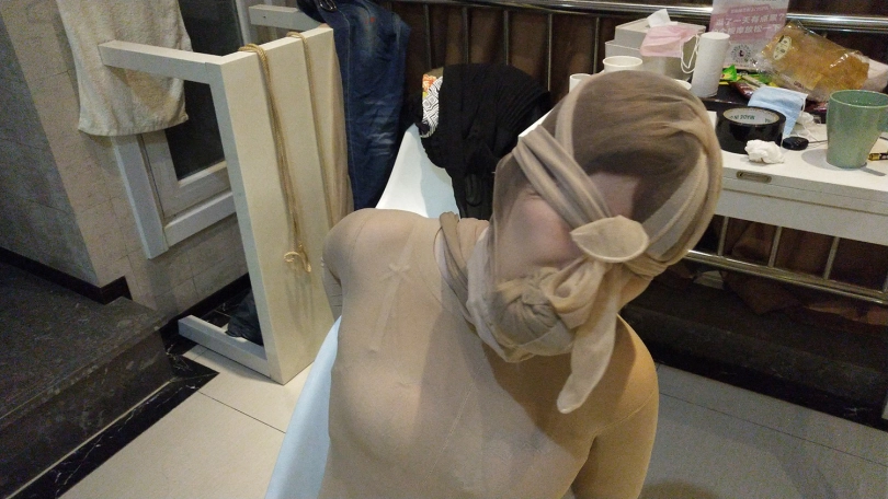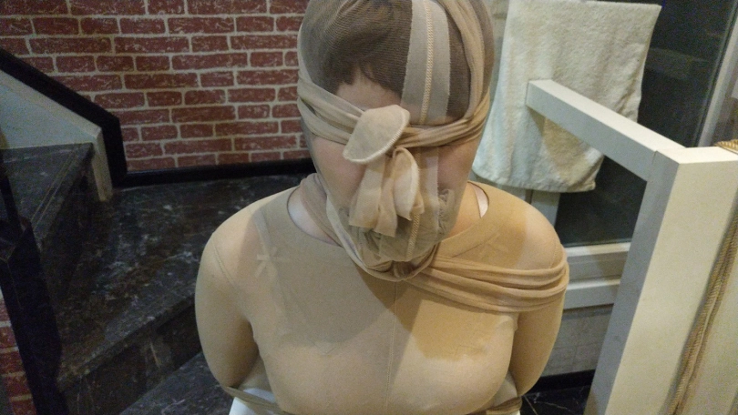 琳洛:连体袜衣,丝袜束缚在椅子上,头上套着丝袜,嘴里也塞着袜子;