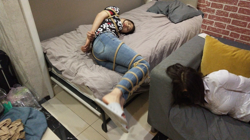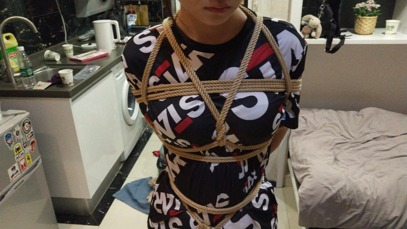 小冷:牛仔裤,休闲装,全身被绳子紧紧束缚,嘴里塞着口球;