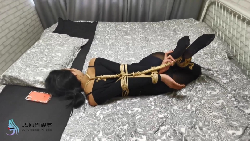 将女子捆好后对她说:“我先出去下,你在这体验捆绑挣扎一会,到时间我在进来给你解开。"
